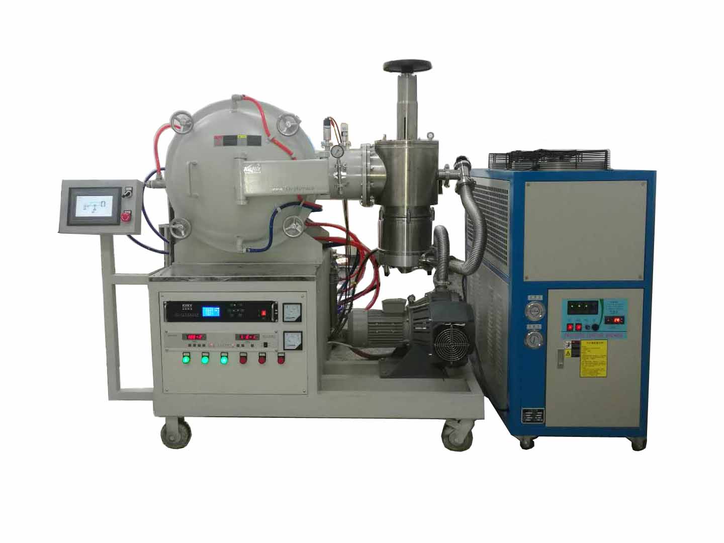 4、水冷裝置。高溫真空電阻爐的爐殼、爐蓋、連接法蘭、電極等部件,均在高溫受熱狀態(tài)下工作,為保證各部件的結(jié)構(gòu)不變形損壞,真空密封圈不因過熱燒毀,對各部件應(yīng)該根據(jù)不同的情況設(shè)計水冷裝置。對于通有大電流的電纜和變壓器,由于自身發(fā)熱可能被燒毀,也需要進行水冷,以保證真空電阻爐能夠正常運行;