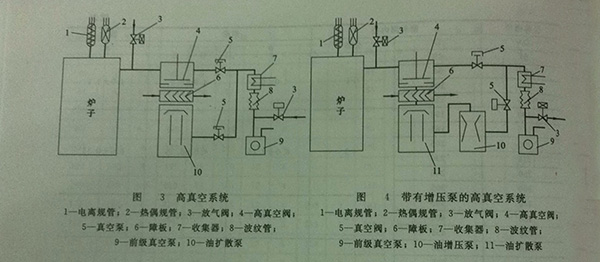 真空燒結(jié)爐,一般預(yù)抽真空爐采用的是這個系統(tǒng)。圖二是具有機(jī)械增壓泵的真空系統(tǒng),真空度在1.33-3*10﹣¹pa,使用此真空系統(tǒng)的一般是真空淬火爐。圖三和圖四是高真空系統(tǒng)和帶有增壓泵的高真空系統(tǒng),一般適用于真空度在1.3*10﹣²-6.6*10﹣4pa范圍內(nèi)的真空熱處理爐,