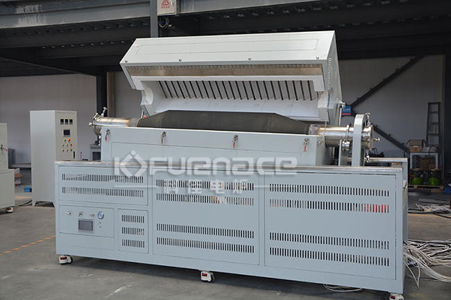 爐管材料采用SUS310S不銹鋼,管內(nèi)有揚料板,可使材料旋轉(zhuǎn)過程中揚料,受熱均勻。爐管兩端用密封法蘭,進氣端裝有旋轉(zhuǎn)接頭可通氣氛,物料從進氣端進出。