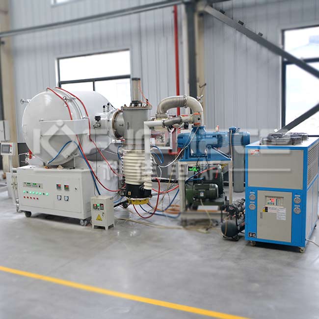 真空度高潔凈鉬箔爐膛,配以機(jī)械泵+擴(kuò)散泵真空機(jī)組,冷態(tài)真空度6.67*10^(-3)Pa; 工作真空度10-^(-2)Pa